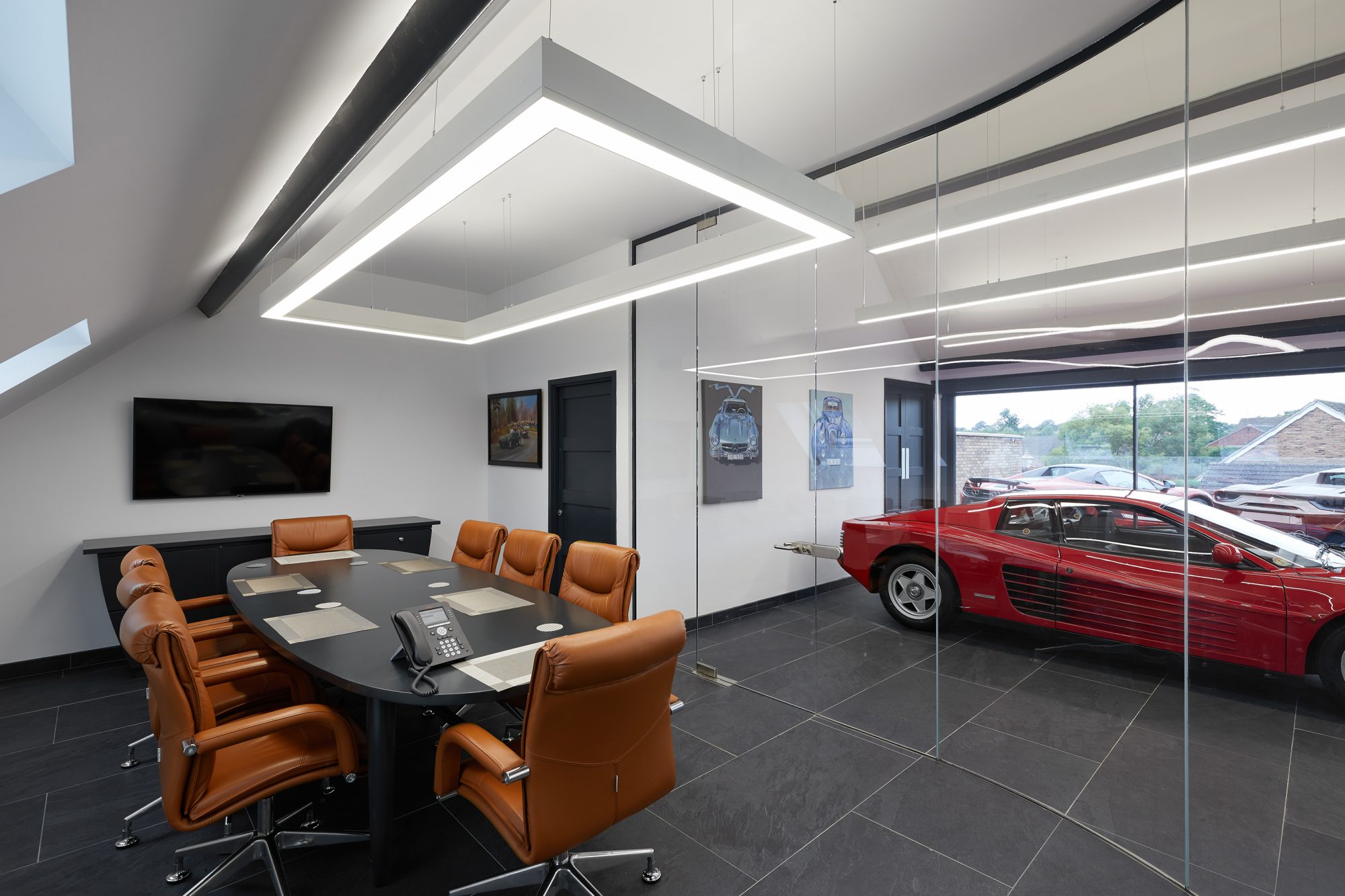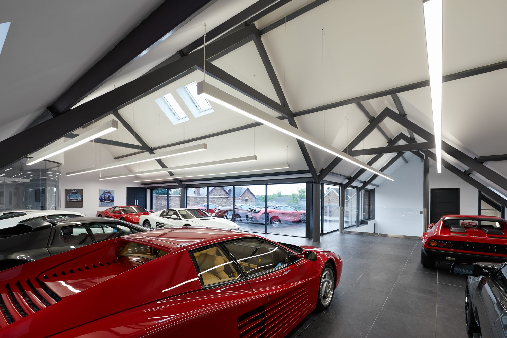 Located in the 40-acre private estate, the car gallery is positioned in front of a man-made lake, featuring a floating underwater bridge. The 15,000 sq ft three-storey building is fitted out with a see-through glass floor, viewing balcony, turntable car display and a giant scissor lift. The gallery houses one of the biggest collections of luxury, performance and classic cars for sale in the UK. The Infinitas System was the perfect choice to create continuous lines of uninterrupted uniform lighting, ideal for illuminating and exhibiting cars in the showroom.